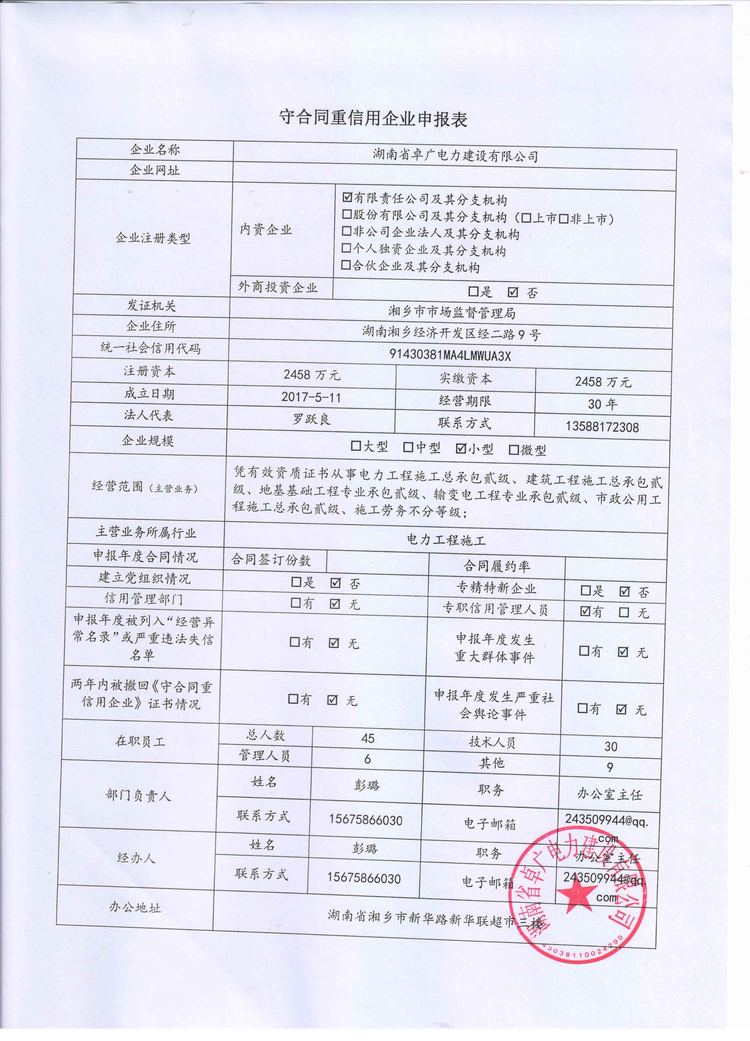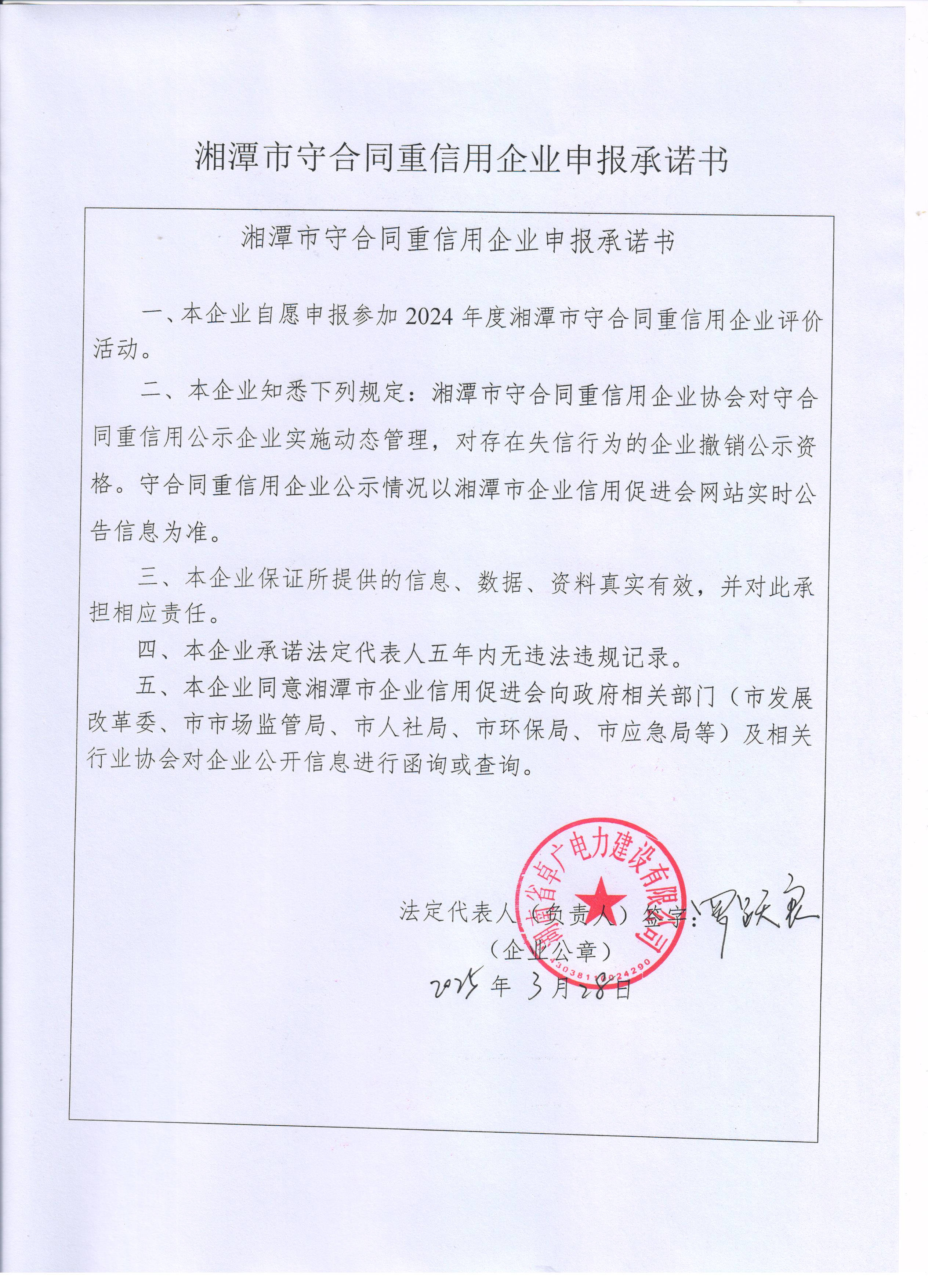 本企業(yè)根據(jù)《湘潭市守合同重信用企業(yè)申報規(guī)定》等編制 2024 年度企業(yè)信用報告書,并保證本報告書內(nèi)容真實、準確、完整。