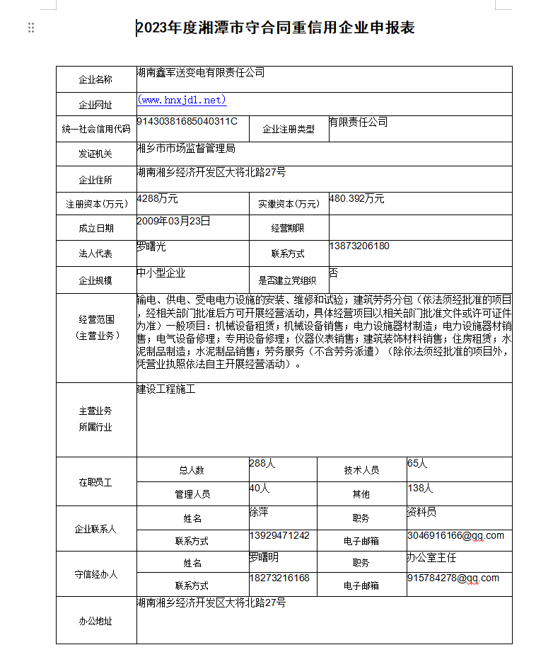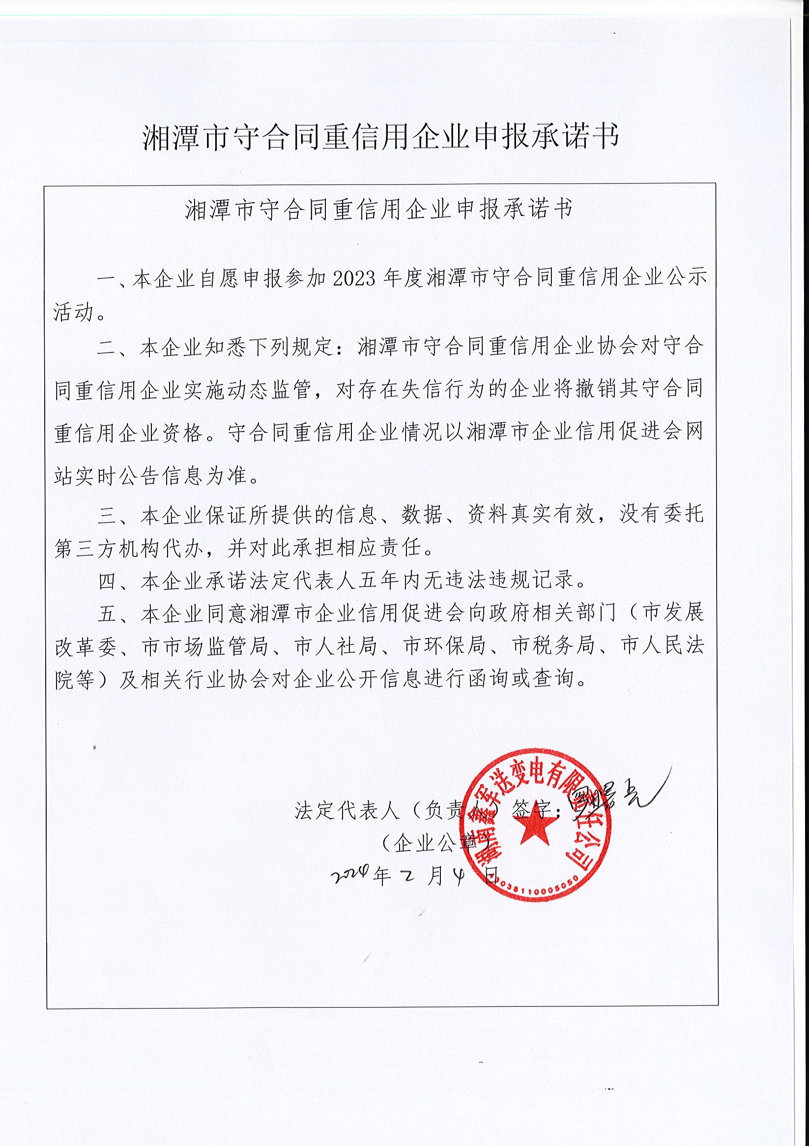 本企業(yè)根據《湘潭市守合同重信用企業(yè)申報規(guī)定》等編制 2023 年度企業(yè)信用報告書,并保證本報告書內容真實、準確、完整。
