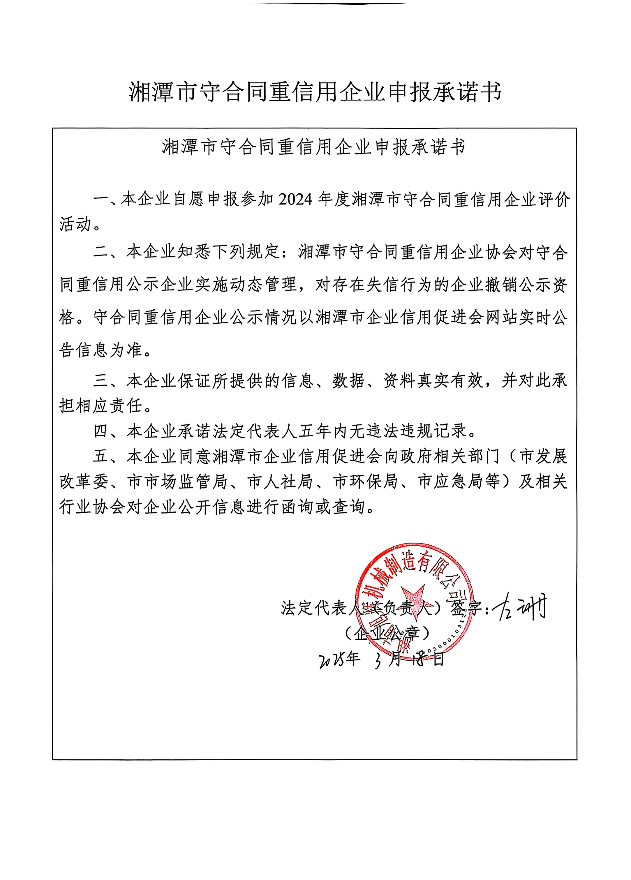 本企業(yè)根據(jù)《湘潭市守合同重信用企業(yè)申報規(guī)定》等編制 2024 年度企業(yè)信用報告書,并保證本報告書內(nèi)容真實、準確、完整。