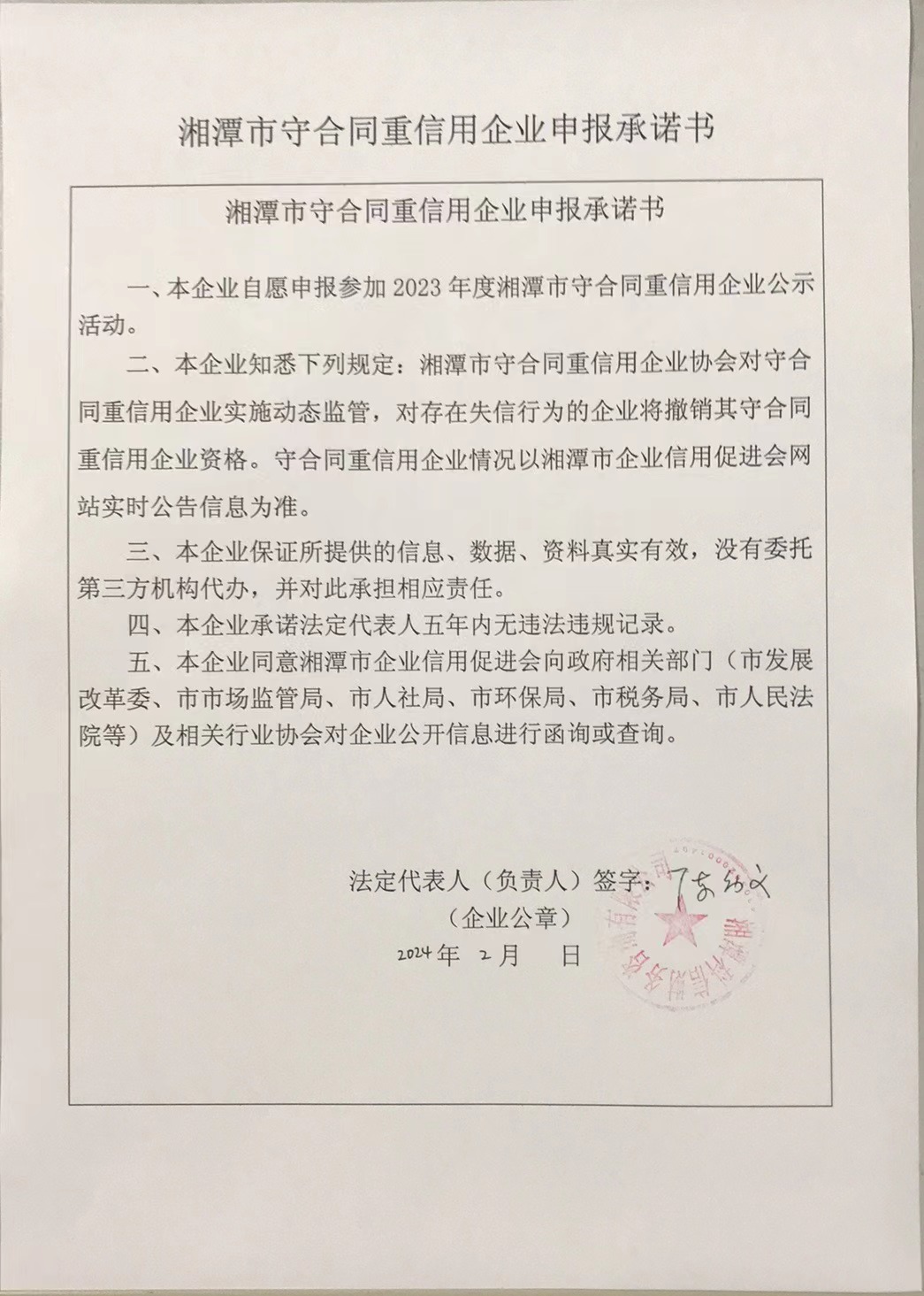 本企業(yè)根據(jù)《湘潭市守合同重信用企業(yè)申報(bào)規(guī)定》等編制 2023 年度企業(yè)信用報(bào)告書(shū),并保證本報(bào)告書(shū)內(nèi)容真實(shí)、準(zhǔn)確、完整。