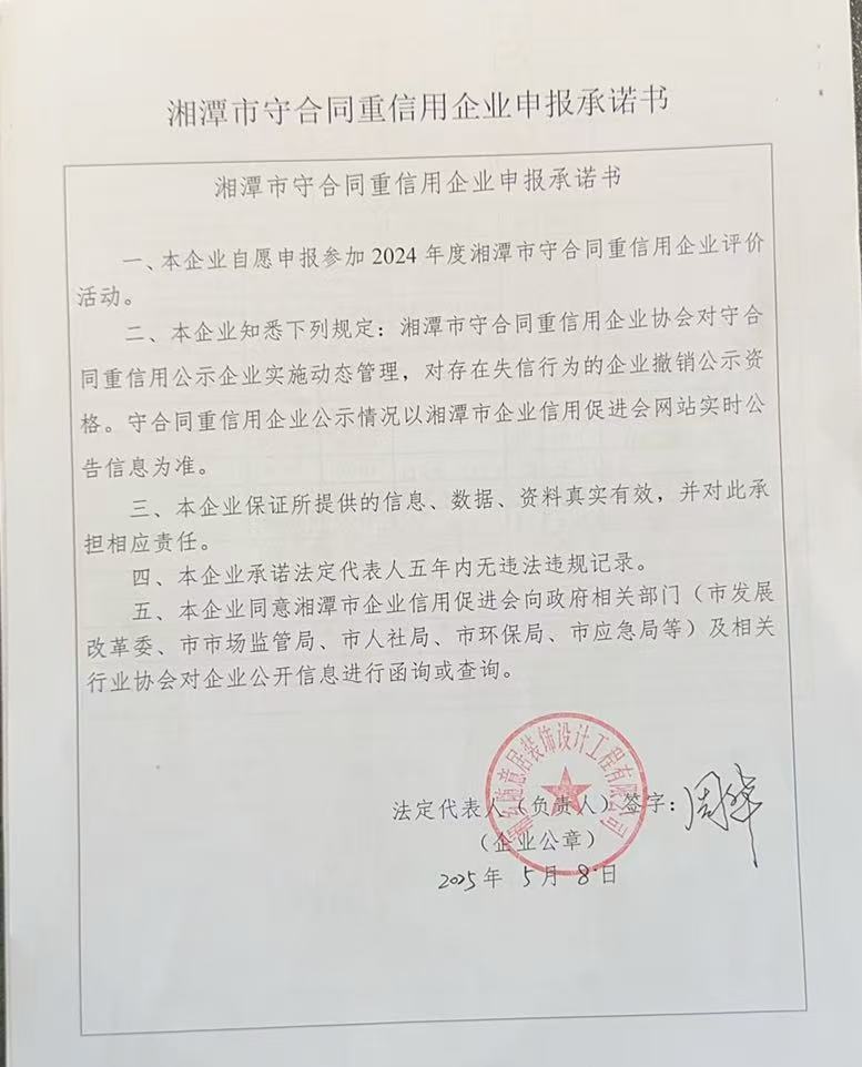 本企業(yè)根據(jù)《湘潭市守合同重信用企業(yè)申報規(guī)定》等編制 2024 年度企業(yè)信用報告書,并保證本報告書內(nèi)容真實、準(zhǔn)確、完整。